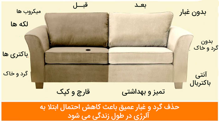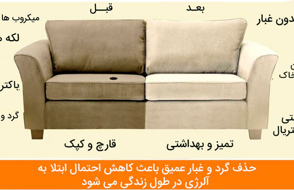 - قبل از اقدام به شستشوی مبل با مواد شوینده حتماً باید مبل گردگیری شده و هرگونه آلودگی و گردوغبار از سطح آن از بین برود.